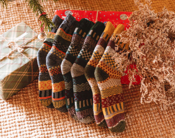 La joie de vivre et la sérénité des activités nordiques se traduisent par des vêtements aux couleurs chaudes. Le plus beau dans les vacances d'hiver, c'est qu'on peut les célébrer tout en portant une tenue confortable, et les chaussettes de Noël en laine mérinos en sont le meilleur exemple.