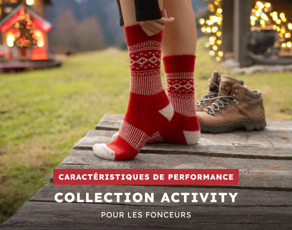 La Collection Activity propose des ensembles à taille basse, qui conservent la joie colorée des chaussettes de Noël et les bienfaits de la laine mérinos.