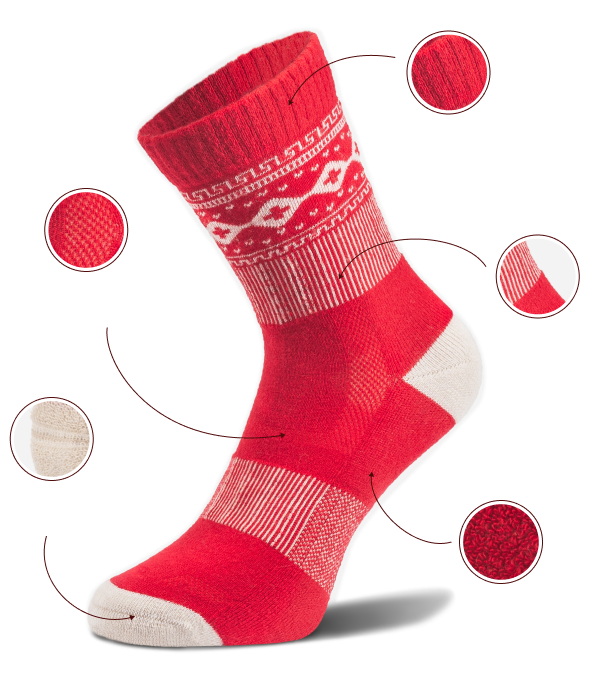 Chaque chaussette possède une bande décorative unique ornée de motifs nordiques entourant la cheville. Les nuances vibrantes de rouge ardent et de rose tendre rehaussent l'imprimé d'un cran. Elles sont parfaites pour les bottes, les chaussures de sport et même les chaussures de ville.